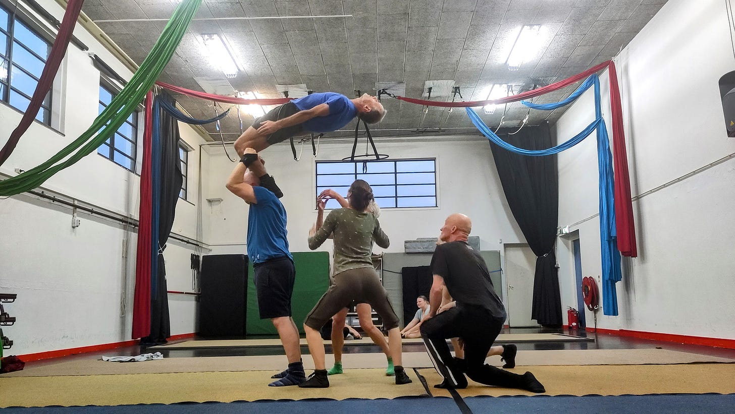 Ben je zestig, kun je nog altijd in een hoek van negentig graden op de schouders van een collega in het luchtledige zweven. Ik zag het in een studio in Den Haag en was met stomheid geslagen. Acrobaten zijn wondermakers, maar er kleeft ook een duisterder kant aan dit vak, merkte ik in de voorbereidingen van Circolo, dat op 13 oktober begint.